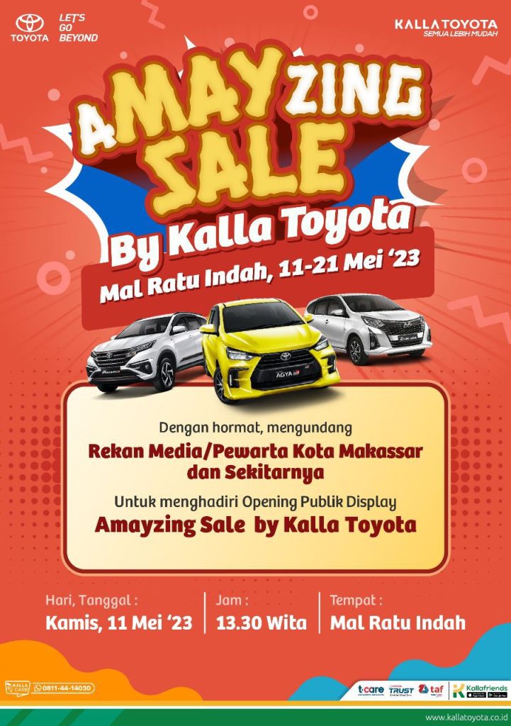 Selain promo menguntungkan Amayzing Sale, Kalla Toyota juga menyiapkan grand prize menarik berupa 1 unit All New Agya bagi pelanggan yang beruntung. Segera berkunjung ke dealer Kalla Toyota terdekat atau event Public Display di Mal Ratu Indah dan miliki Toyota impian Anda,” ungkap Suliadin.