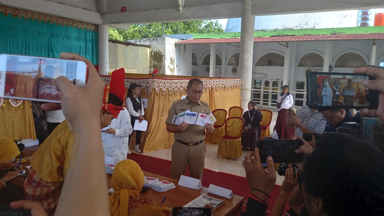 Semua lancar aman Alhamdulillah kita lihat TPS petugasnya ada pakai baju adat dengan senyuman, penuh kegembiraan.